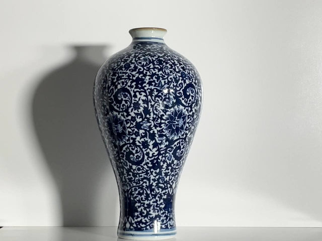 Handcrafted ceramic vase with a rich indigo-blue floral design