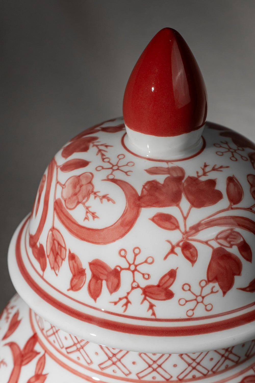 Hand-painted floral and bird motifs in terracotta red