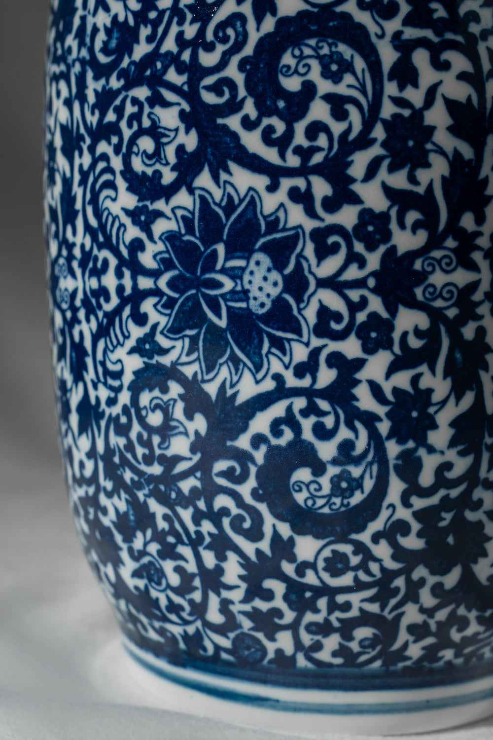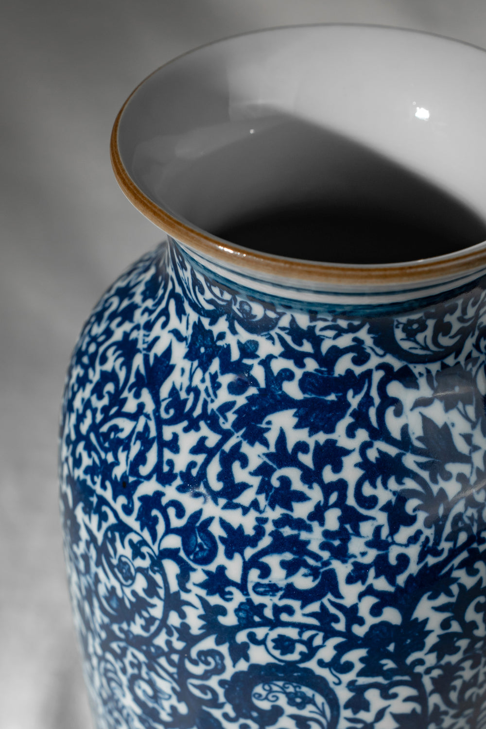 Handcrafted ceramic vase with a rich navy-blue floral design
